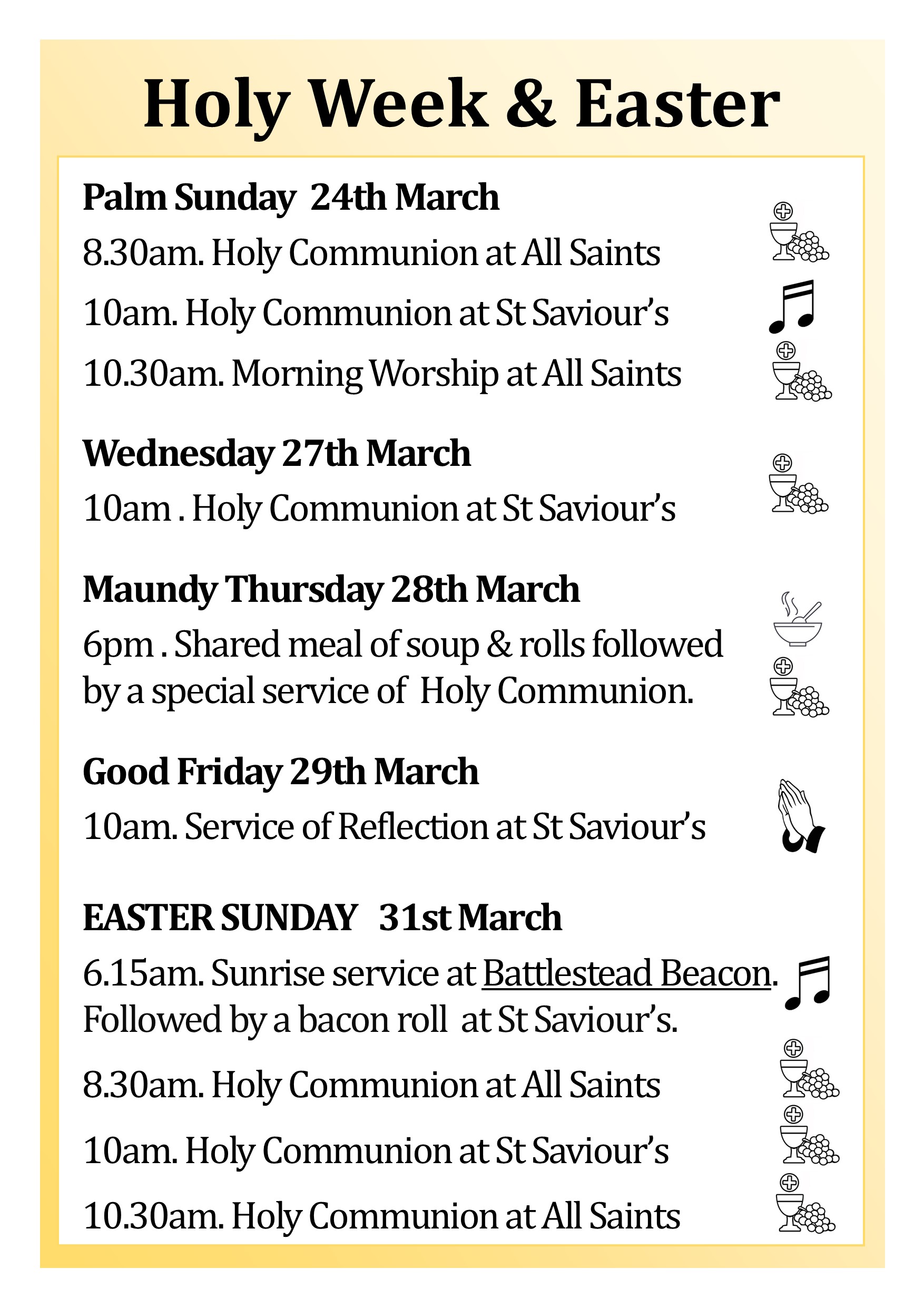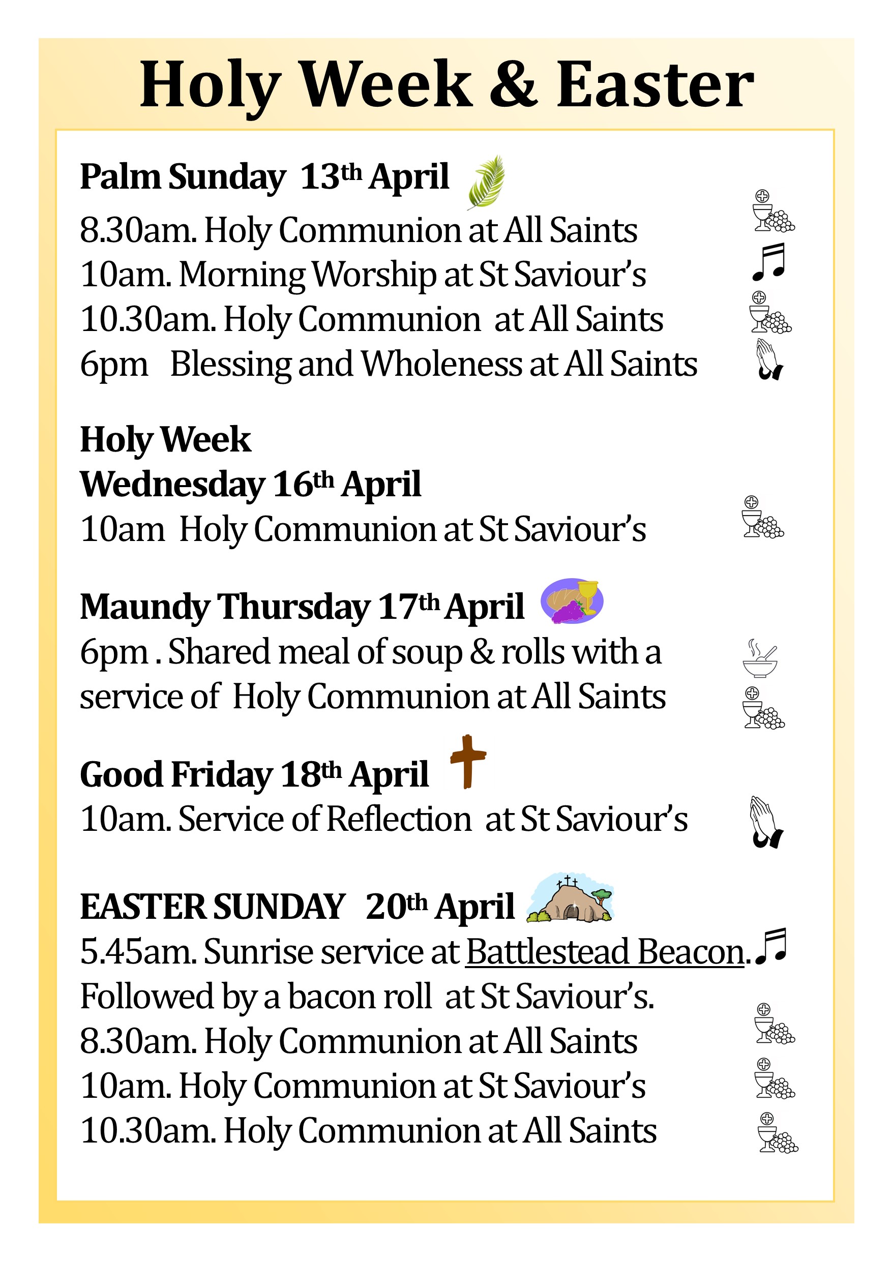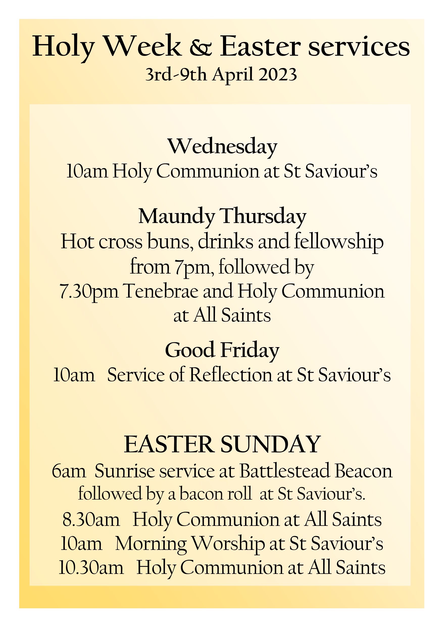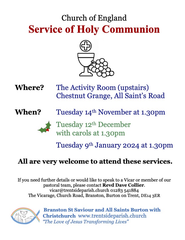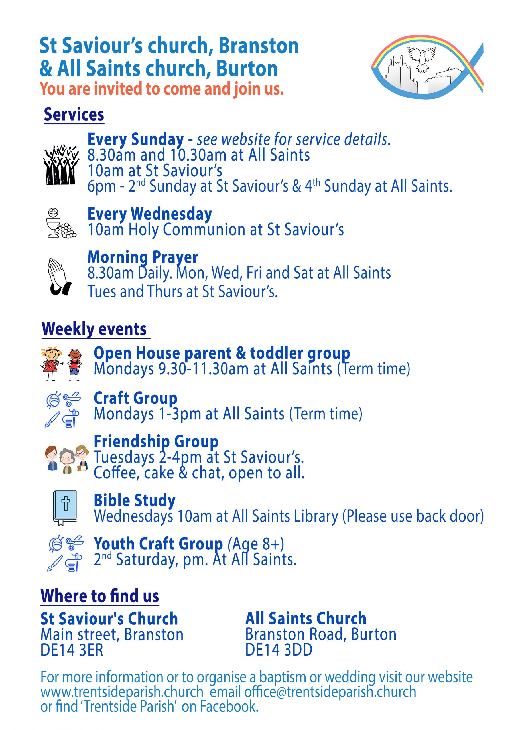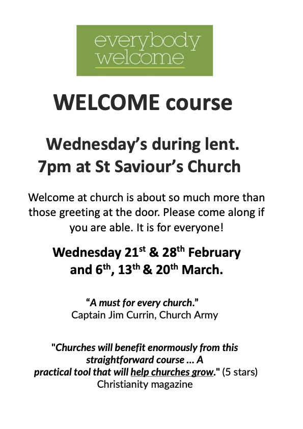 For this week’s notice sheet visit out ‘Weekly Worship’ page.Upcoming Events Regular Events News and updates Remembrance and Armisticeby Parish Office | 13th November 2024 | News | 0 CommentsIt is our honour every year to gather with those from our community to...Read MoreHome and study groupsby Parish Office | 6th November 2024 | News | 0 CommentsBuilding faith and friendships through prayer, study and fellowship. New...Read MoreYouth Craft Groupby Parish Office | 17th April 2024 | News | 0 CommentsMeeting every four weeks at All Saints church hall for crafts, fun, fellowship...Read MoreChristmas Bazaarby Parish Office | 7th November 2022 | News | 0 CommentsCome along to our Christmas Bazaar at St Saviour's church on Saturday 30th...Read MoreChristmas Services 2024by Parish Office | 24th November 2021 | News | 0 CommentsChristmas Service dates and times. 2019Read MoreFriendship Groupby Parish Office | 16th August 2021 | News | 0 CommentsFRIENDSHIP GROUP Every Tuesday at St Saviours from 2pm until 4pm. Everyone is...Read MoreAll Saints Craft Groupby Parish Office | 14th May 2021 | News | 0 CommentsCraft group. All welcome!Read MoreOpen House Toddler Groupby Parish Office | 30th January 2020 | News | 0 CommentsRETURNING 7th JUNERead MorePast Events Peace Concert 28th July 2019 Garden Party and Dog Show at The Vicarage. June 2019 Homefront Jumble Sale HARVEST CELEBRATIONS! Mothering Sunday Flowers at St Saviour's Baptism in the Sea! Holiday Club 2017 Easter Sunday Sunrise Service